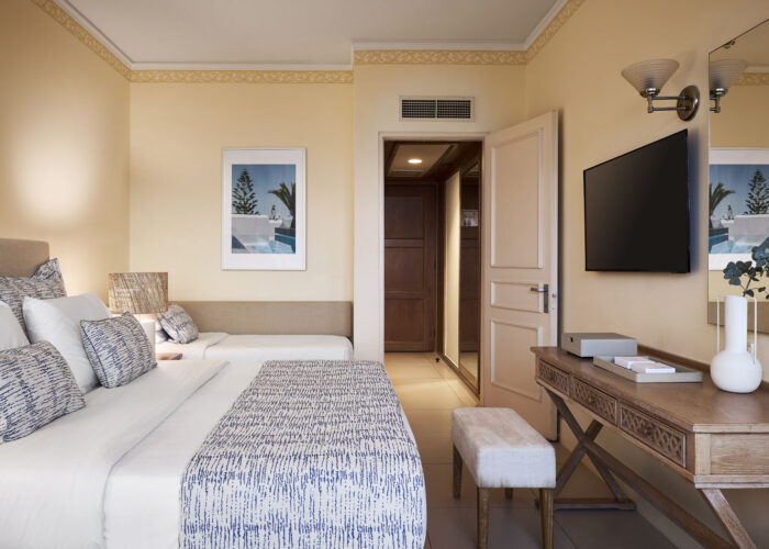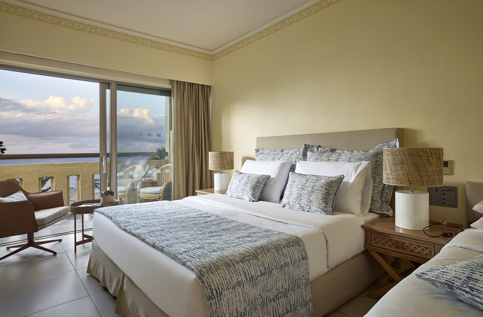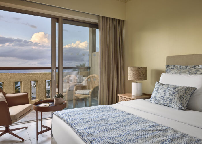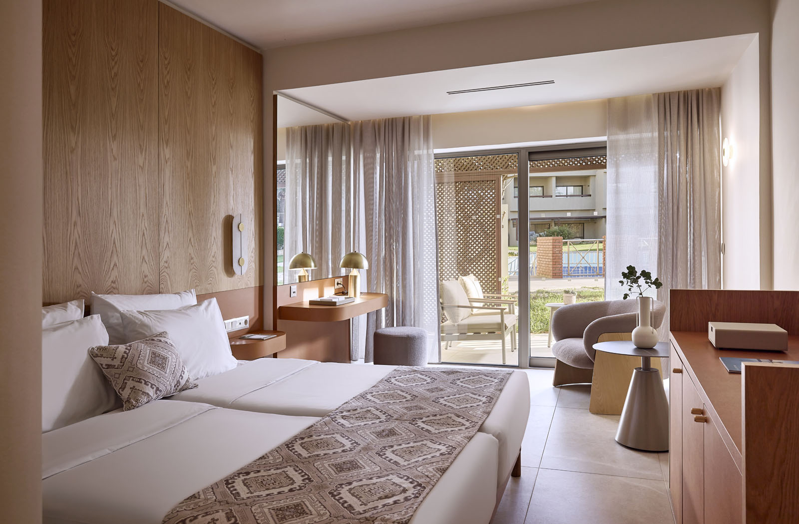 Unsere gemütlichen Doppelzimmer mit Blick auf den Garten bieten einen friedlichen Rückzugsort für alle, die Ruhe und Erholung suchen. Diese Zimmer sind einladend eingerichtet und verfügen über einen privaten Balkon mit Blick auf die üppigen Gärten des Resorts. Tauchen Sie ein in die Ruhe der natürlichen Schönheit Kretas und lassen Sie den Stress des Alltags hinter sich.