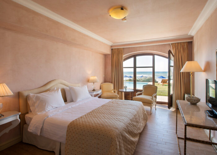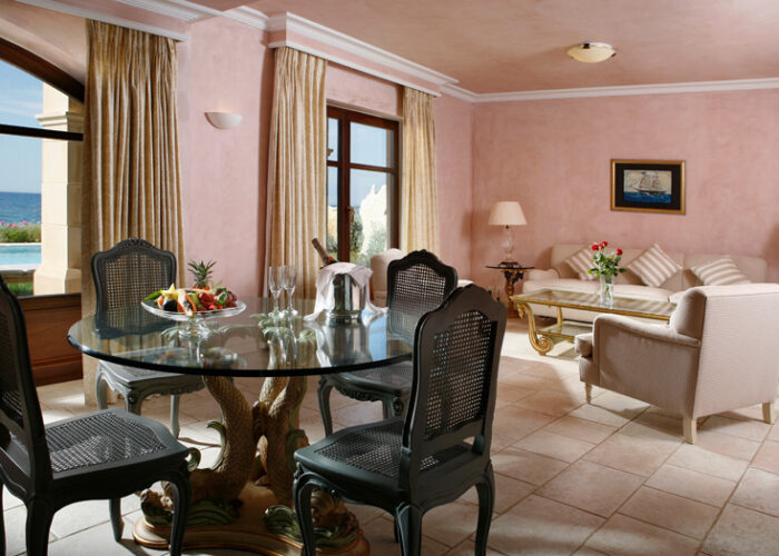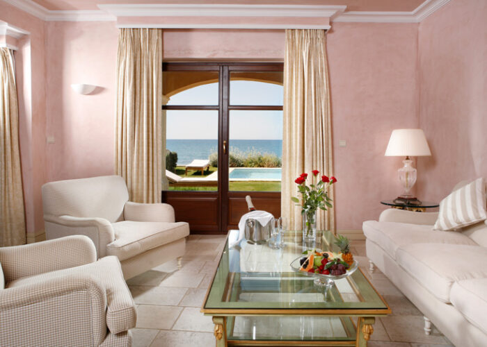 Literally a few steps away from the Aegean sea, these Mythica Bungalow Suites feature a beachfront private pool and an outdoor lounge with exotic vegetation and comfortable deck chairs. Indoors, an intimate lounge with a dining corner and a beautifully appointed bedroom with en-suite bathroom awaits. As a true gem, our Beachfront Bungalow Suites combine French Renaissance style with subtle architectural elements to create a haven of relaxation.